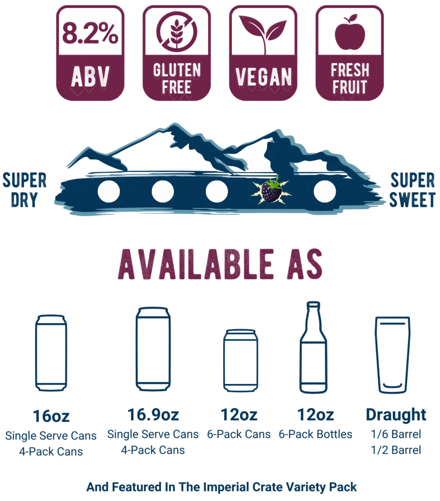 Imperial Berry Cider takes the same smooth and bold taste of our Imperial cider with an added jolt of delicious berry flavor. At 8.2% ABV, this blend of Blue Ridge apples, blackberry, and raspberry, is shockingly smooth and electrifyingly bold.